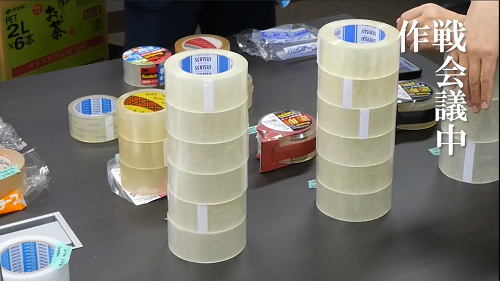 研究を始める前、研究員たちは厚さ0.09mmのテープを触りあって「全然ちがう!」「おー!」と厚みの違いに盛り上がります。シングルのダンボール箱は、厚さ0.062mmのテープに耐えることが分かったため、厚さ0.062mmで耐えられなかったダブルのダンボール箱で研究します。