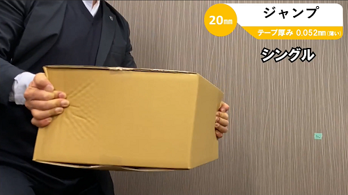 続いて、シングルのダンボール箱を持ってのジャンプは成功です。しかし、テープは剥がれるギリギリのところです。
